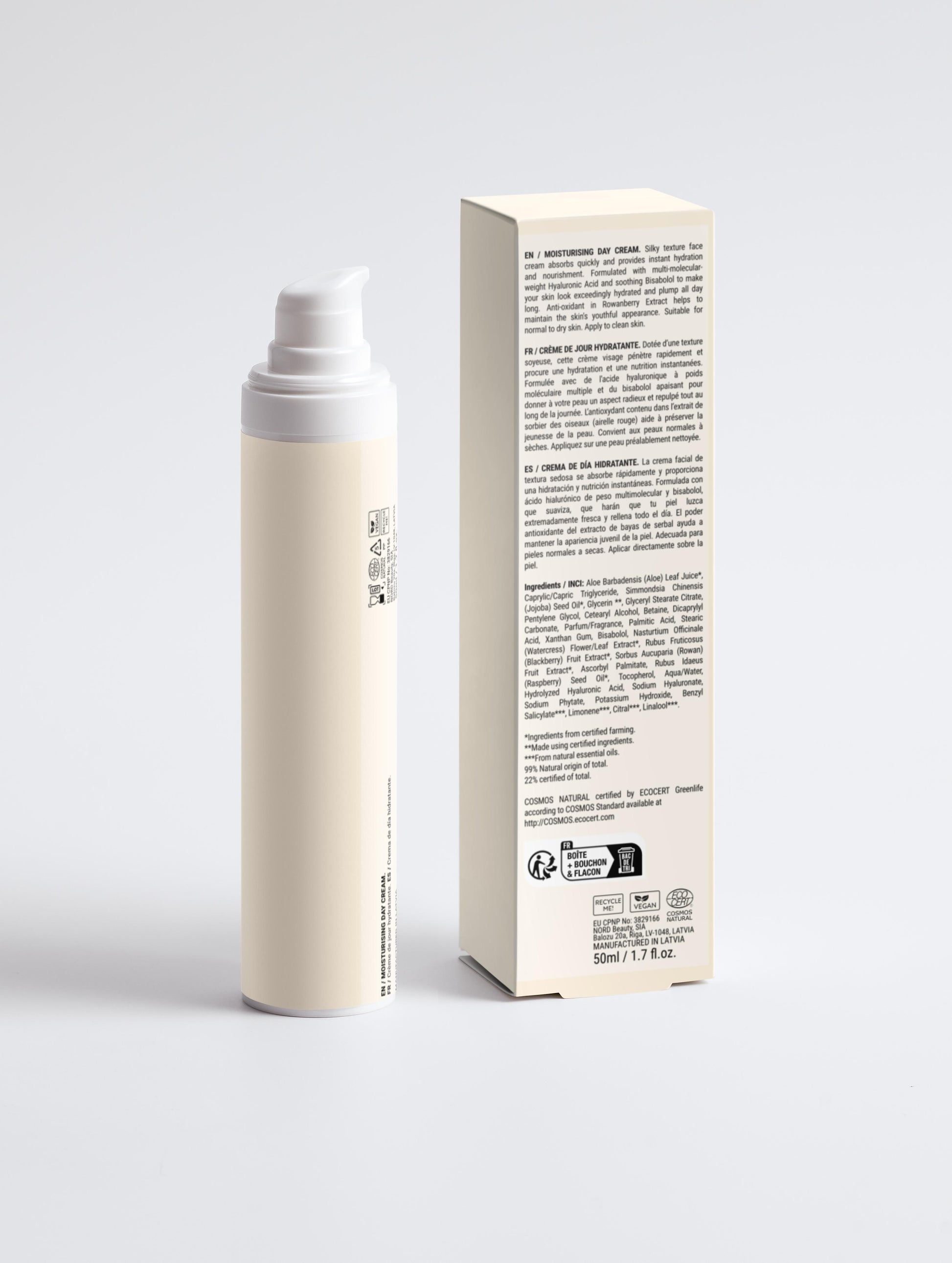 The Moisturising Day Cream contains multi-molecular-weight Hyaluronic Acid and Bisabolol, which deeply hydrate and soothe dry skin, leaving it plump and smooth throughout the day.